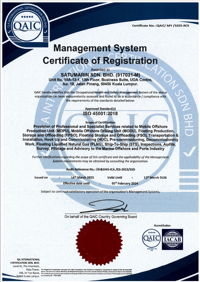 Satumarin Sdn Bhd ISO 45001:2018 and ISO 9001:2015 certifications from Institute of Accredited Conformity & Assessment Board (IACAB)